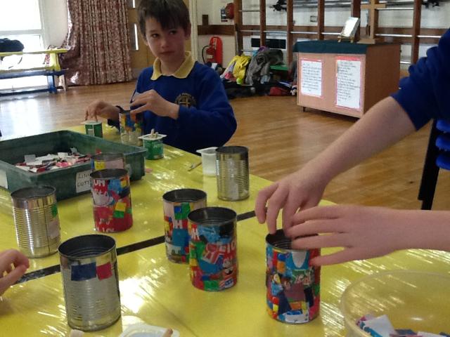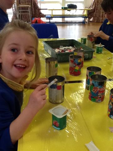 We made a start on our planters this morning. We've used recycled tin cans and have decoupaged them using a variety of left over bits of wrapping paper. This amused the children as some of the paper was old Christmas wrap. They all did a great job and are all looking forward to planting some tomatoes after the Easter break.