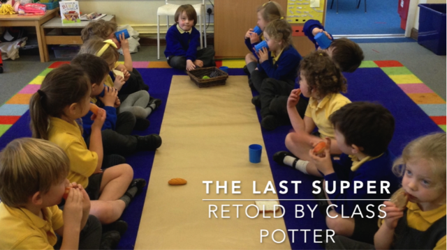 Our reception children from Class Potter focused on 'The Last Supper' and exhibited a wonderful 'Last Supper' banner that they had all worked hard to create back in class. They sang 'Take this bread' and we were all impressed with how successful they were in retelling events that happended during 'The Last Supper'.